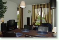 - pokoju dziennego wyposażonego w dwuosobowy rozkładany narożnik, stół z czterema krzesłami, stolik kawowy,