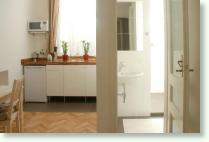 znajduje się na parterze kamienicy. Składa się z oddzielnego pokoju i dużej kuchni oraz łazienki. Apartament urządzono w przytulnym stylu, łącząc oryginalne elementy wnętrza z nowoczesnym jego wyposażeniem.