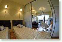 SYPIALNIA - dwa pojedyncze łóżka, które można zsunąć w jedno łoże małżeńskie, szafka na ubrania, nastrojowe światło, drzwi ze szkła matowego zapewniające światło i intymność